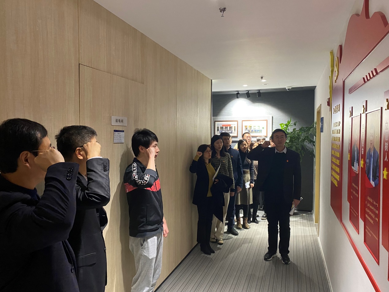 最后,党支部举行刘亦石同志入党宣誓仪式。全体党员同志在网络空间安全公司党建墙下宣誓。宣誓完毕后,刘树春副董事长为刘亦石同志佩戴党员徽章。