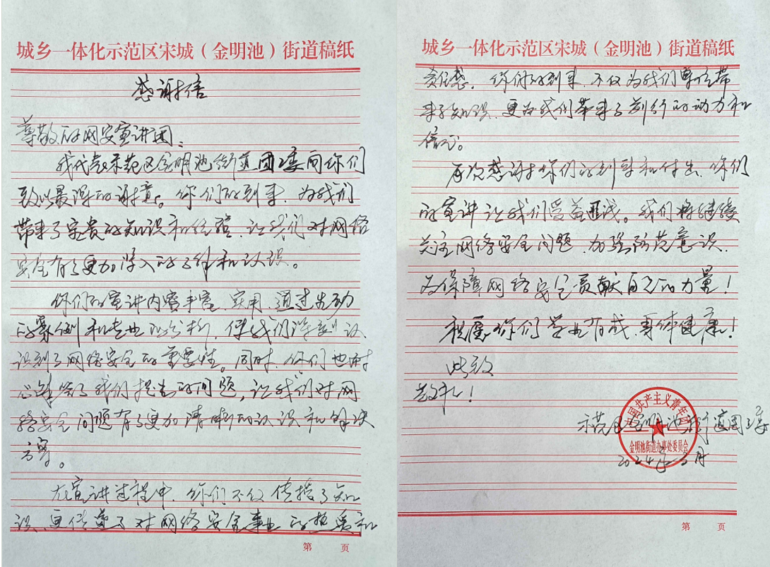 网络空间安全宣讲团与老员工“返家乡”活动相结合,让宣讲成员们将所学的网络安全知识带回家乡,为家乡的网络安全建设贡献自己的力量。通过线上线下相结合的方式,向当地居民普及网络安全知识,讲解网络诈骗的常见形式、识别方法和防范措施,有效的增强民众的网络防范意识并调高了自我保护的能力。