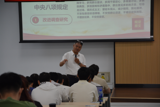 在会议的第一项议程中,学院经理罗洪斌同志为全体党员讲授了八项规定专题党课。本次党课以“深入学习中央八项规定精神”为主题,从多个维度进行了深刻解读。罗洪斌同志详细讲解了中央八项规定的主要内容,包括改进调查研究、精简会议活动、精简文件简报、规范出访活动、改进警卫工作、改进新闻报道、严格文稿发表和厉行勤俭节约等八个方面。他指出,中央八项规定精神是全党同志的共同要求,体现了以上率下的精神,是符合中央八项规定内涵的一系列政策规定的统称,每一名党员都应当严格遵守。罗经理还通过一系列详实的数据,进一步深入解读了八项规定的重要意义和实践价值,强调中央八项规定是新时代共产党人的一张“金色名片”。全体党员在党课学习中认真聆听、积极思考,纷纷表示要将中央八项规定精神内化于心、外化于行,以实际行动践行党的优良作风。