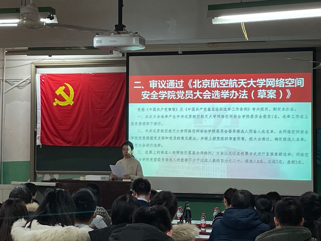 首轮选举结果中,有两位候选人票数相同且均未超过应到会党员的半数,故大会根据表决通过的选举章程再次进行了针对两位平票候选人的投票。第二轮投票结果中,两位候选人的得票数仍均未超过应到会党员的半数。经与会全体党员表决,多数人同意减少新一届党委委员数量至6人,其中81人赞同,2人反对,10人弃权。最终,在监票人监督下,经计票人计票,从9位候选人中差额选举产生了6位中共太阳成官网网络空间安全学委员会委员,分别为:刘建伟、伍前红、李圆圆、尚涛、祝贺、蒋燕玲(按姓氏笔画排序)。大会在激昂的《国际歌》声中圆满结束。
