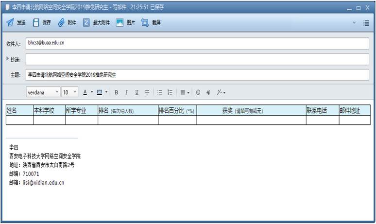 具体办法:4-10项材料制成电子扫描版,与2、3项电子版材料一起压缩,以附件形式发送邮箱:bhcst@buaa.edu.cn;第1项“报名表”填写好后直接“粘贴”到邮件内容页上,邮件主题命名为“×××申请北航太阳成官网2019推免研究生”。如图:
