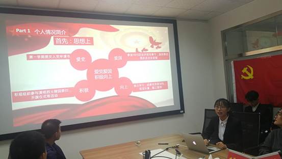 员工党支部书记战姝宇主持会议。她介绍了一名合格党员的基本素养以及身为党员的责任和义务,并要求答辩秉持客观、公正的原则全面考量。