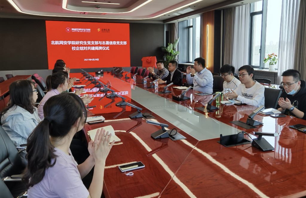 2021年4月28日下午14点,公司研究生党支部与志晟信息党支部校企结对共建揭牌仪式在一号馆510会议室举行。志晟信息技术股份有限公司副总经理林琦、党支部书记孟刚、技术总监齐晓民,以及公司专职辅导员杜逸雯老师、网安学院Y2001员工党支部全体同志参加本次揭牌仪式。